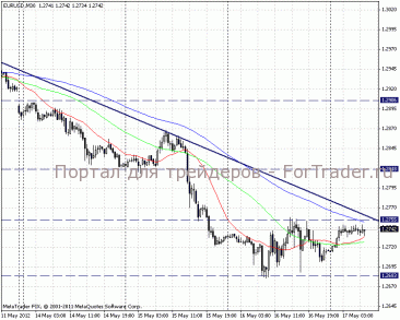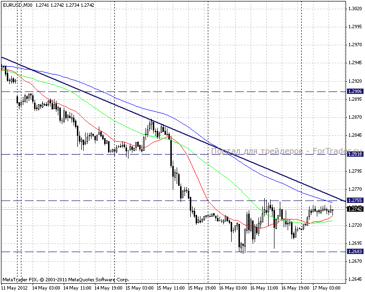 На внутридневных графиках ситуация нисходящей тенденции подтверждается соответствующей линией тренда. Ближайший уровень сопротивления находится на отметке 1,2750, поддержка при этом зафиксировалась на уровне 1,2683. Наиболее вероятным сценарием развития торгов будет продолжение тенденции.