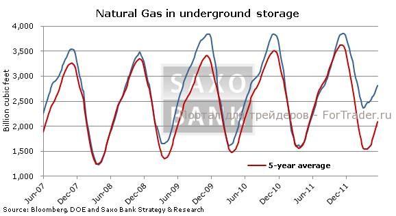 В первой половине мая цены на природный газ начали стремительно расти на фоне того, что низкие цены, наконец, начали влиять на уровни производства, а потребление стало увеличиваться из-за того, что американские электрогенераторы перешли с угля на газ. Но когда цена приблизилась к трем долларам за миллион британских тепловых единиц, преимущество газа перед углем начало исчезать, в результате чего темпы такого перехода замедлились. Предполагается, что для создания более сбалансированного рынка цена не должна превышать 2,5 доллара до конца сезона накопления запасов (до октября). На приведенном ниже графике показано, сколько подземных газохранилищ по всей территории США в настоящий момент превышают пятилетнее среднее значение по уровням запасов газа. Таким образом, главным спасением для низких цен на данный момент является сохранение низких цен на протяжении еще нескольких месяцев.