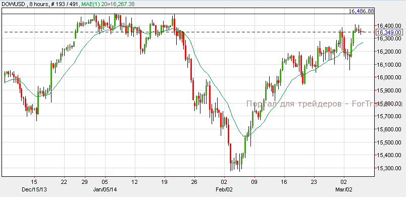 Американские индексы завершили торговую сессию смешано после выхода уровня занятости в несельскохозяйственном секторе (ADP Non-Farm Employment Change) и «Бежевой книги». NASDAQ вырос на 0.20%, а Dow Jones потерял от стоимости 0.22%. Федеральный резерв заявил, что на данный момент признаков инфляции нет, а на экономику некоторых штатов влияют неблагоприятные погодные условия. Согласно техническому анализу 8-часового графика, Dow Jones торгуется на сильном уровне сопротивления 16,490 и индекс может вновь пробить этот уровень. Dow может продолжить рост к отметке 16,700. Сегодня ожидается выход количества заявок на пособия по безработице с показателями 336 тыс. против 348 тыс. ранее.