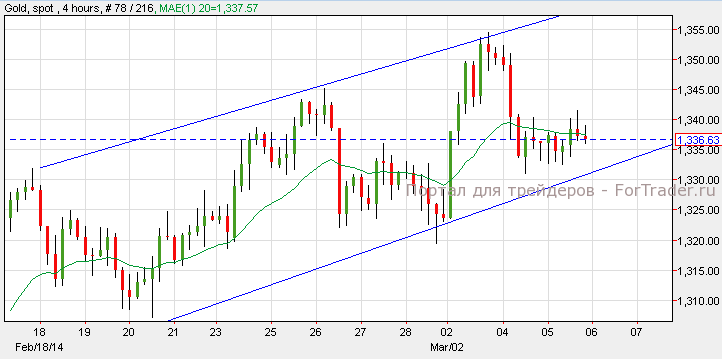 Цена на золото не изменилась составив $1,336. Золото торгуется в восходящем канале на уровне поддержки 1,325. Возможен рост золота к уровню сопротивления 1,350, но скорее всего произойдет прорыв этого уровня и драгоценный металл вырастет отметке 1,375.