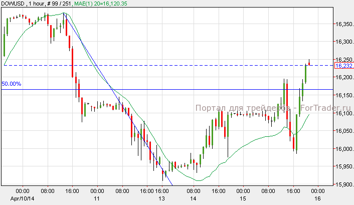 Вчерашние торги американских индексов сопровождались высокой волатильностью. Торговый день закрылся с повышением в результате того, что несколько компаний объявили свои позитивные квартальные отчеты о доходах. S&P 500 вырос на 0.68%, NASDAQ вырос на 0.38%, а Dow Jones добавил к стоимости 0.55%. Согласно техническому анализу 1-часового графика, Dow Jones пробил 50%-ный уровень коррекции Фибоначчи на отметке 16,160. Задержка на этом уровне продолжит восходящий импульс индекса.