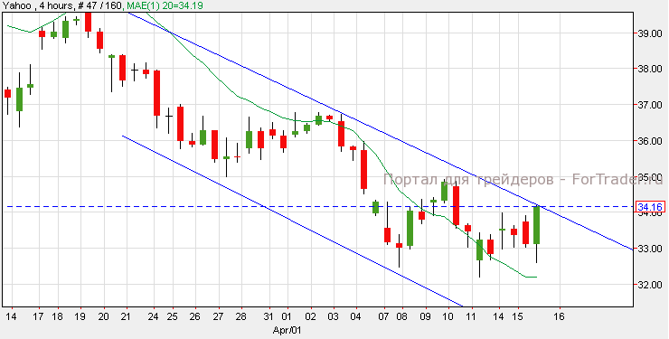 Акции Yahoo выросли на 2.27%, что значительно выше прогнозов по первому кварталу. Согласно техническому анализу графика, акции Yahoo торгуются в нисходящем канале и коснулись верхнего уровня сопротивления на отметке 34. Если акции смогут пробить уровень сопротивления, они сформируют фигуру «двойное дно» и продолжат рост к отметке 36.80. Задержка на этом уровне сопротивления продолжит торговлю акций в нисходящем канале.