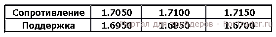 Фунт вырос против основных валют после выхода уточненного объема бизнес-инвестиций, который оказался лучше прогнозов. Согласно техническому анализу графика, пара GBP/USD торгуется около 5-летнего максимума и двигается в диапазоне 100 пунктов между отметками 1.6950 и 1.7050. Прорыв уровня сопротивления продолжит восходящий тренд к отметке 1.7150, а прорыв ниже уровня поддержки вернет пару к отметке 1.6700. Сегодня состоится публикация чистого объема кредитов выданных физическим лицам м/м и количества одобренных ипотечных кредитов.