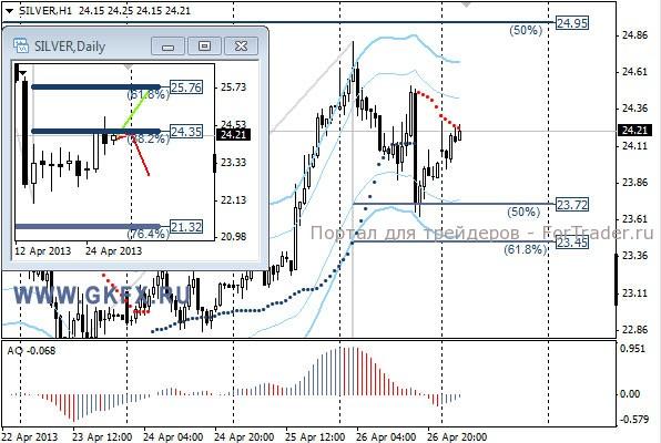 Цены на серебро также не проявили желание продолжить рост. Ожидаю продолжения коррекции. Рекомендаций сегодня не даю, так как безопасного места для входа нет. Прошедшая неделя отработала  по красному сценарию. Традиционно делаю два варианта движения цены на неделю, основной красный и альтернативный зеленый. Значимые уровни на сегодня отмечены на часовом графике. Индикатор АО находится у нуля, указывая на неопределенность. Индикатор тренда указывает на снижение. Сегодня наблюдаем за поведением рынка.