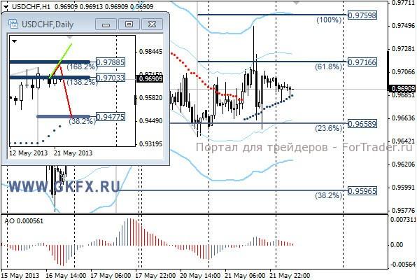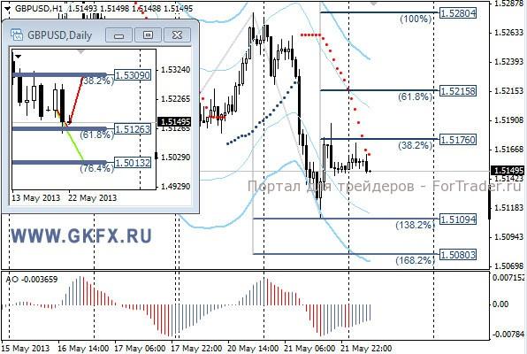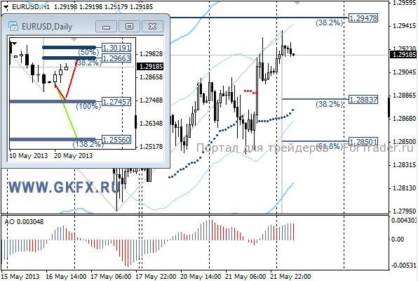 Пара EURUSD продолжила коррекцию в рамках ожидания протоколов ФРС США и выступления председателя ФРС Б. Бернанке. После вчерашних выступлений представителей ФРС стало ясно, что протоколы последнего заседания будут, скорее всего, нейтральными. Соответственно из этого и стоит выстраивать стратегию. Цена вчера не дошла до предполагаемой границы и сделка по рекомендации не исполнилась. Сегодня можно попытаться продать с тех же границ, но в расчете на то, что к протоколам заседания ФРС будет стоять хотя бы безубыток. На эту неделю традиционно рассматриваю два варианта возможного движения цены, основной красный и альтернативный зеленый. Значимые уровни на сегодня отмечены на часовом графике. Индикатор АО находится в положительной зоне и снижается, указывая на коррекцию перед возможным продолжением роста. Индикатор тренда указывает на рост. Sell от 1,2940 или выше со стопом 1,2955. Цель 1,2900. Не забываем ставить стоп в безубыток при первой же возможности.