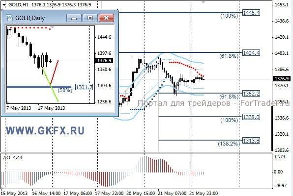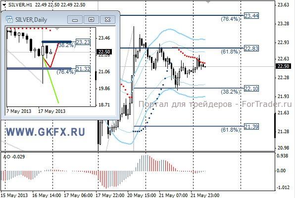 Цены на золото вчера снижались, но индекс доллара не позволил спуститься ниже. Индекс доллара продолжает торговаться ниже 84,00 и это удерживает золото от дальнейшего снижения. Сегодня думаю, будет развязка дальнейшей динамики драгметаллов после публикации протоколов последнего заседания ФРС США и выступление Б. Бернанке. Традиционно делаю два варианта движения цены на неделю, основной красный и альтернативный зеленый. Значимые уровни на сегодня отмечены на часовом графике. Индикатор АО находится в отрицательной зоне и растет, указывая на коррекцию перед возможным продолжением снижения. Индикатор тренда указывает на снижение. Все внимание на индекс доллара.
