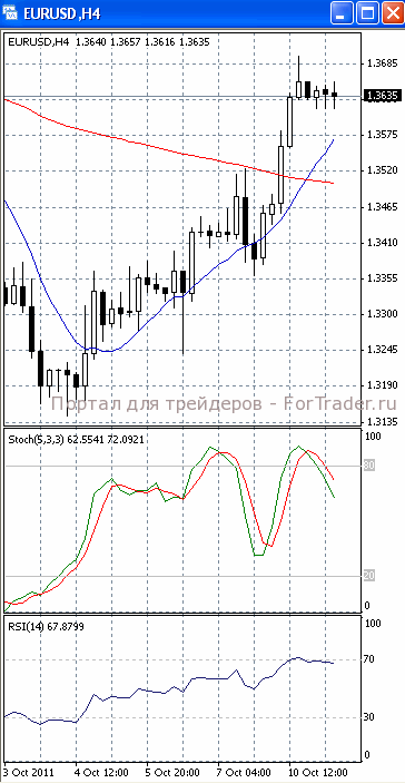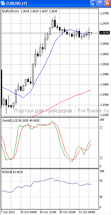 На часовом графике (рис.2) SS и RSI уверенно направлены вверх. В том же направлении готовится развернуться и «быстрая» скользящая средняя. Все это подтверждает предположение о возможности прорыва указанного уровня сопротивления и продолжения роста цен.