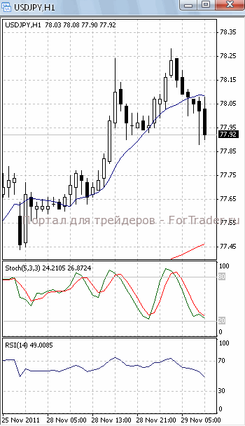 На часовом графике (рис.2) МА(100) все еще уверенно направлена вверх, сигнализируя о сохранении потенциала восходящего движения в среднесрочной перспективе. МА (10) наметила разворот вниз. В медвежьем направлении устремлены и SS, и RSI. Все это подтверждает предположение о возможности прорыва поддержки 78.00 и продолжения падения цен.