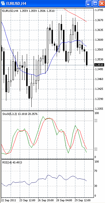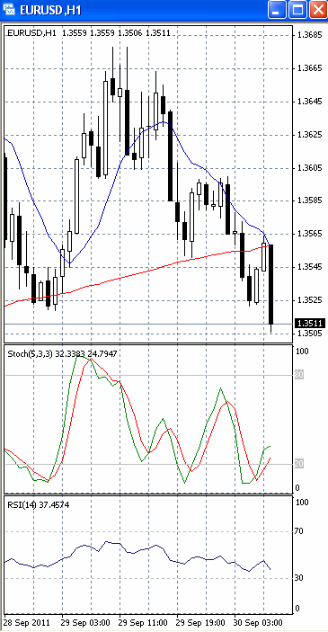 На часовом графике (рис.2) МА (10) уверенно направлена вниз. К тому же, скользящие средние формируют «мертвый крест». Все это подтверждает предположение о возможности прорыва указанного уровня поддержки и продолжения падения цен. Вниз разворачиваются и SS, и RSI. Таким образом, на наш взгляд, возможность продаж с близким стоп-лоссом целесообразно рассматривать только ниже уровня поддержки 1.35.