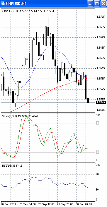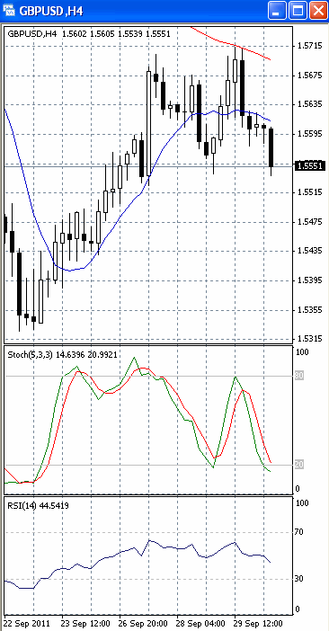 Цены тестируют уровень поддержки 1.5550. Если он будет пройден, продолжится падение, первичной целью которого, скорее всего, станет отметка 1.55. Вероятность такого исхода позволяет предположить, что на 4-х часовом графике (рис.1) и «быстрая», и «медленная» скользящие средние достаточно уверенно устремлены вниз. В медвежьем направлении развернулся и осциллятор RSI. SS, напротив, входит в зону перепроданности и наметил разворот в бычьем направлении, сигнализируя в пользу возвратного хода к отметке 1.56.