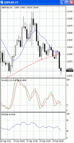 На часовом графике (рис.2) МА (100) и МА (10) сформировали медвежье пересечение, тем самым, подтверждая предположение о вероятности прорыва указанного уровня поддержки и продолжения нисходящей фазы движения. Вниз направлены и оба осциллятора. В свете сказанного, по нашему мнению, продажи с близким стоп-лоссом целесообразно рассматривать только ниже уровня поддержки 1.5550.