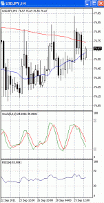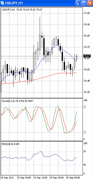 На часовом графике (рис.2) скользящие средние разнонаправлены. SS и RSI устремлены в бычьем направлении, тем самым, подтверждая предположение о возможности подъема цен к отметке 77.00. В свете сказанного, на наш взгляд, ситуация складывается неопределенная. Возможность покупок с близким стоп-лоссом стоит рассматривать только выше уровня сопротивления 77.00.