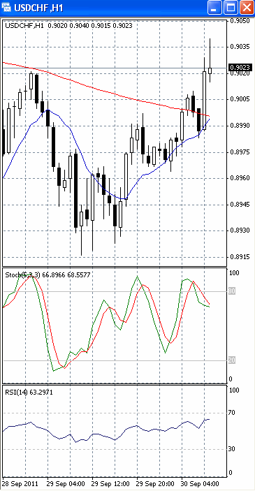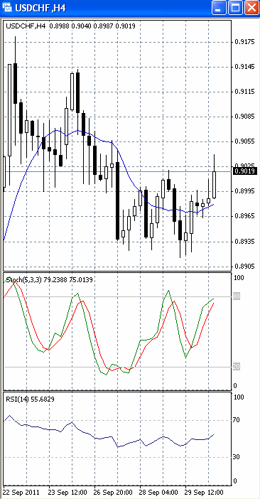 Пара пытается зафиксироваться выше уровня сопротивления 0.90. Если им это удастся, стоит ждать дальнейшего роста к отметке 0.9050. В пользу такого исхода позволяет говорить то, что на 4-х часовом графике (рис.1) МА (10) приобретает восходящую направленность. Вверх развернулся и осциллятор RSI. SS, напротив, готовится развернуться в противоположную сторону. Поэтому не стоит полностью исключать вероятность возвратного хода.