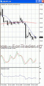 Цены возвращаются к уровню поддержки 76.00. Если он все же будет пройден, продолжится падение, первичной целью которого, скорее всего, станет отметка 75.80. Возможность такого исхода позволяет предположить то, что на 4-х часовом графике (рис.1) МА (100) направлена вниз. МА (10) и оба осциллятора, напротив, приобрели восходящую направленность. Поэтому не стоит полностью исключать вероятность возврата цен к отметке 76.30/40.