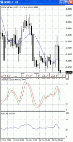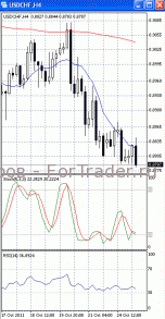 Пара движется к уровню поддержки 0.8770. Если он будет пройден, стоит ждать дальнейшего падения, первичной целью которого, скорее всего, станет отметка 0.87. Возможность такого исхода позволяет предположить и то, что на 4-х часовом графике (рис.1) МА (10) и МА (100) устремлены вниз. Нисходящую направленность приобретают и оба осциллятора.