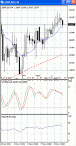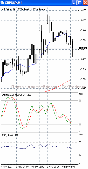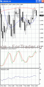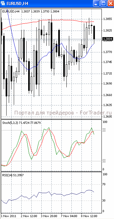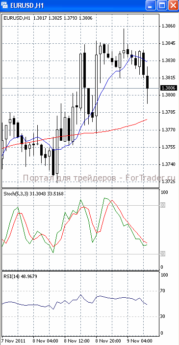 На часовом графике (рис.2) и «медленная» скользящая средняя направлена вверх. Это позволяет говорить о сохранении потенциала восходящего движения. В том же направлении разворачивается и осциллятор SS. Но МА (10) и RSI приобретают нисходящую направленность, сигнализируя в пользу прорыва уровня 1.38 и продолжения падения.