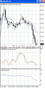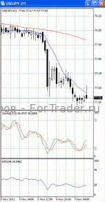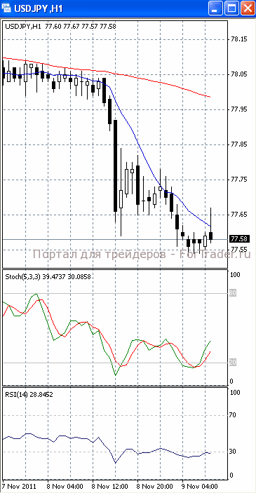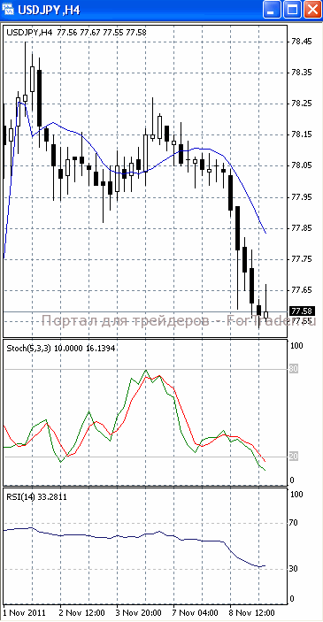 Цены пытаются зафиксироваться ниже уровня поддержки 77.60. Если им это все же удастся. Стоит ждать дальнейшего падения, первичной целью которого, скорее всего, станет отметка 77.30 и, далее, 77.00. Вероятность такого исхода позволяет предположить то, что на 4-х часовом графике (рис.1) МА (10) уверенно устремлена вниз. В то же время SS (в зоне перепроданности) и RSI наметили разворот в противоположную сторону. Поэтому не стоит полностью исключать возможность отката к отметке 78.00.
