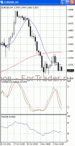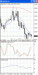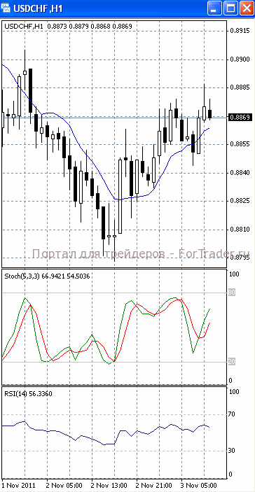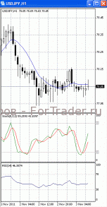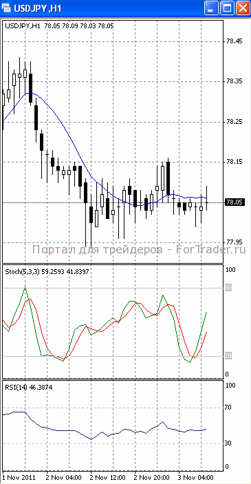 На часовом графике (рис.2) «быстрая» скользящая средняя разворачивается вниз, тем самым, сигнализируя в пользу падения к нижней границе указанного диапазона с последующим ее тестированием. SS и RSI направлены вверх.