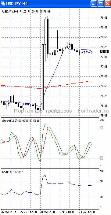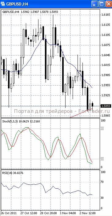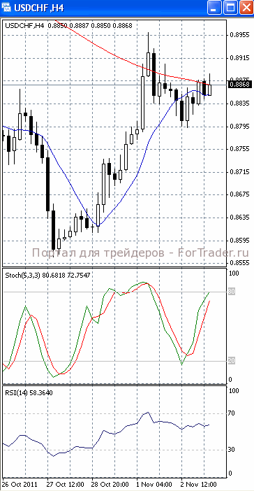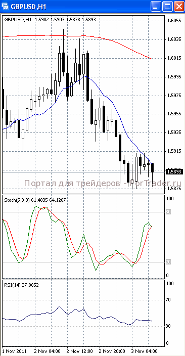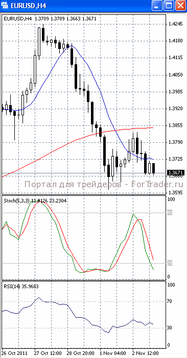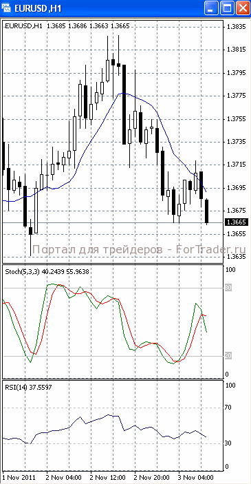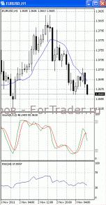 На часовом графике (рис.2) «быстрая» скользящая средняя уверенно направлена вниз. В том же направлении устремлены и SS, и RSI. Все это подтверждает предположение о вероятности развития нисходящего движения.