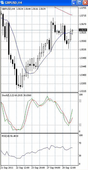 Цены движутся к уровню сопротивления 1.5660. Если он будет пройден, продолжится подъем, первичной целью которого, скорее всего, станет отметка 1.57. Однако на 4-х часовом графике (рис.1) «быстрая» скользящая средняя приобретает нисходящую направленность. Вниз устремлена и «медленная». Все это позволяет предположить, что после краткосрочного подъема, цены возобновят нисходящее движение. Осцилляторы направлены вверх и пока не подают признаков разворота.