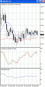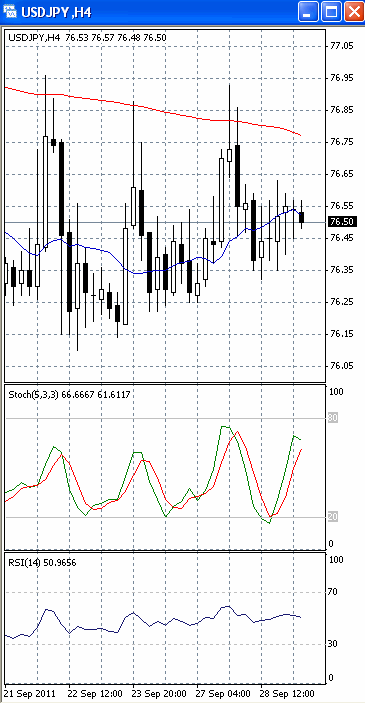 Цены по-прежнему удерживаются в пределах диапазона, ограниченного уровнями 76.15 – 76.70. На 4-х часовом графике (рис.1) МА (100) и МА (10) приобретают нисходящую направленность. В ту же сторону наметили разворот и оба осциллятора. Все это позволяет предположить, что цены устремятся к нижней границе указанного диапазона с последующим ее тестированием.