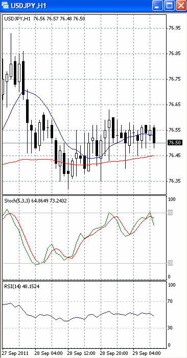 На часовом графике (рис.2) скользящие средние разнонаправлены. SS и RSI развернулись в медвежьем направлении, тем самым, подтверждая предположение о возможности падения цен к отметке 76.15.