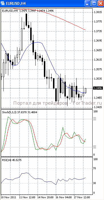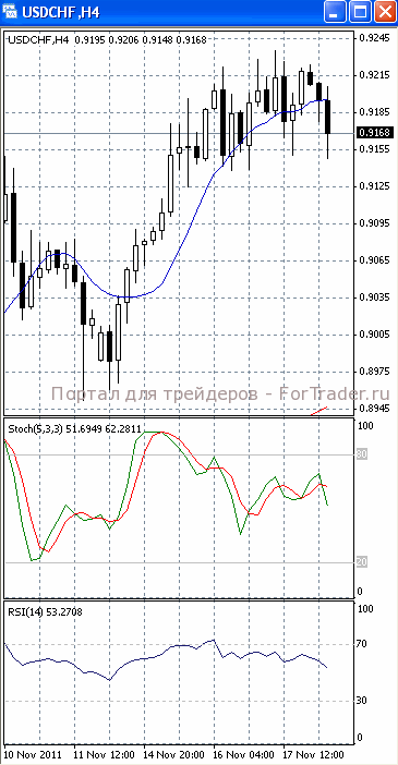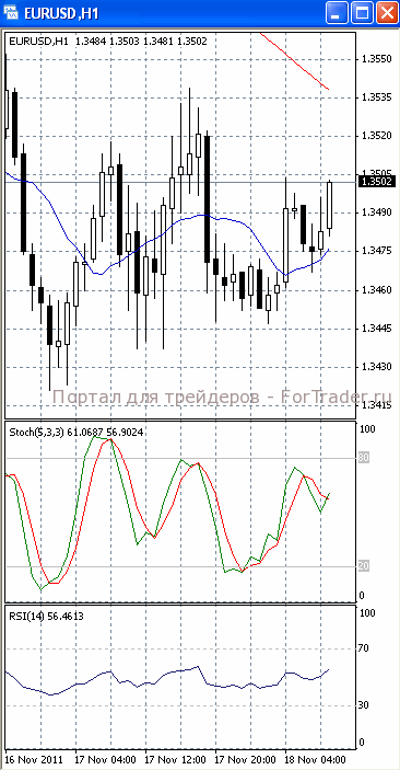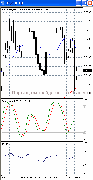На часовом графике (рис.2) «быстрая» скользящая средняя направлена вниз. В медвежьем направлении развернулся и SS. Все это подтверждает предположение о возможности развития нисходящей фазы движения. МА (100) устремлена вверх, в ту же сторону развернулся и RSI, сигнализируя в пользу начала фазы роста.