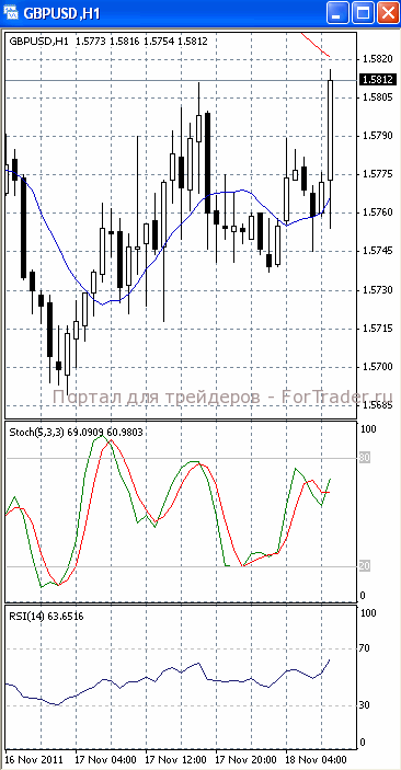 На часовом графике (рис.2) ситуация складывается аналогичным образом. «Быстрая» скользящая средняя приобретает восходящую направленность, тем самым, подтверждая предположение о возможности прорыва указанного уровня сопротивления и продолжения фазы роста. В бычьем направлении устремлены и SS, и RSI. «Медленная» скользящая средняя направлена вниз, что свидетельствует о сохранении потенциала нисходящего движения.