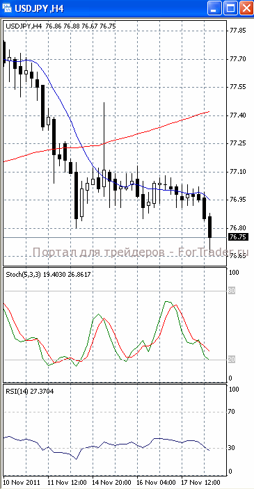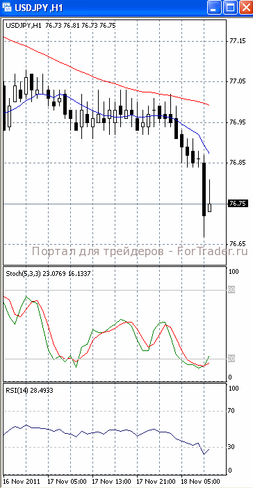 На часовом графике (рис.2) обе скользящие средние устремлены вниз, тем самым, подтверждая предположение о возможности дальнейшего падения. SS и RSI разворачивается вверх, сигнализируя в пользу возврата цен к отметке 77.00.