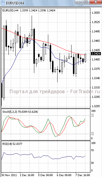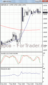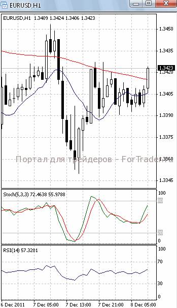 На часовом графике (рис.2) ситуация складывается аналогичным образом. «Быстрая» скользящая средняя, SS и RSI приобрели восходящую направленность, сигнализируя в пользу продолжения фазы роста. «Медленная» скользящая средняя устремлена вниз и пока не подает признаков разворота. Это подтверждает предположение о вероятности возобновления нисходящего движения.