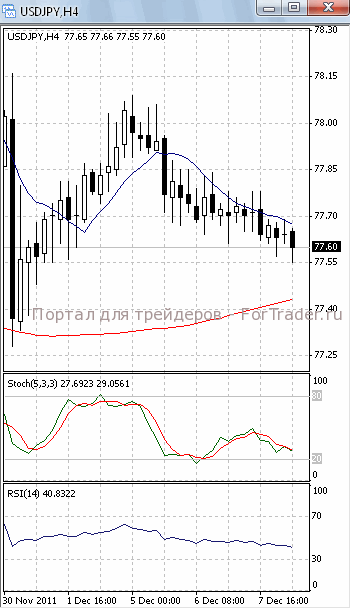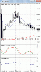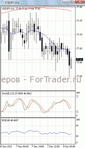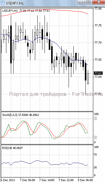 На часовом графике (рис.2) и «быстрая», и «медленная» скользящие средние устремлены вниз. Это подтверждает предположение о возможности прорыва указанного уровня поддержки и дальнейшего падения. Но SS и RSI развернулись в противоположную сторону, тем самым, сигнализируя в пользу того, что цены, оттолкнувшись от указанной отметки, начнут подъем к сопротивлению 78.00.