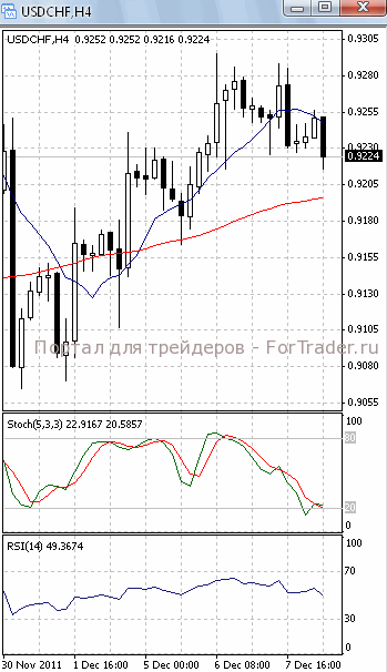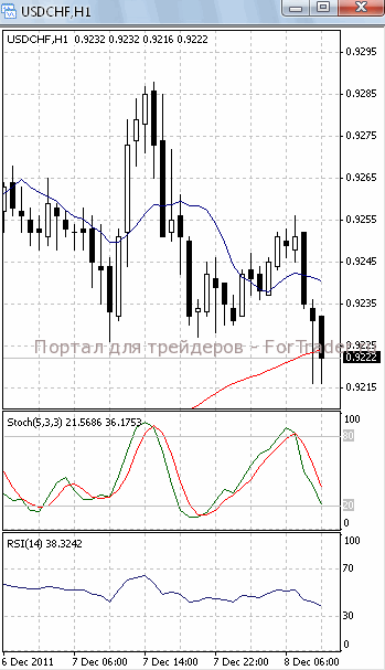 На часовом графике (рис.2) ситуация складывается аналогичным образом. МА (10), SS и RSI направлены вниз, тем самым, подтверждая предположение о возможности прорыва уровня поддержки 0.92 и дальнейшего падения. Но МА (100) все еще устремлена вверх, сигнализируя в пользу сохранения потенциала восходящего движения.