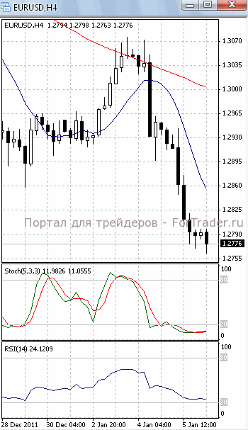 Цены уже обновили годовой минимум. Они пытаются зафиксироваться ниже уровня поддержки 1.2780. Если им это удастся, продолжится падение, первичной целью которого, скорее всего, станет отметка 1.2720. О возможности развития нисходящего движения позволяет говорить то, что на 4-х часовом графике (рис.1) обе скользящие средние уверенно направлены вниз. В медвежьем направлении развернулся и осциллятор RSI. SS (в зоне перепроданности) готовится развернуться в противоположную сторону. Поэтому не стоит полностью исключать возможность возвратного хода к отметке 1.2830/40.