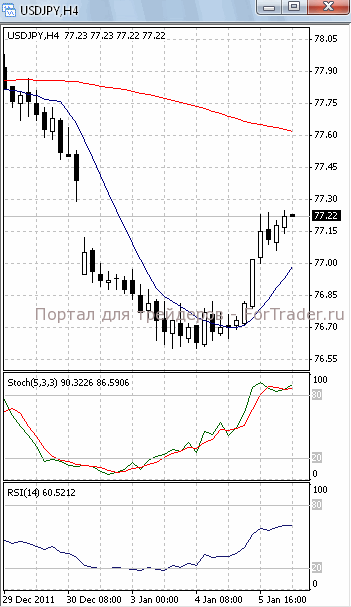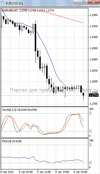 На часовом графике (рис.2) МА (100) разворачивается в бычьем направлении, тем самым, подтверждая предположение о возможности развития восходящего движения. МА (10), SS и RSI наметили разворот вниз, что свидетельствует в пользу отката.