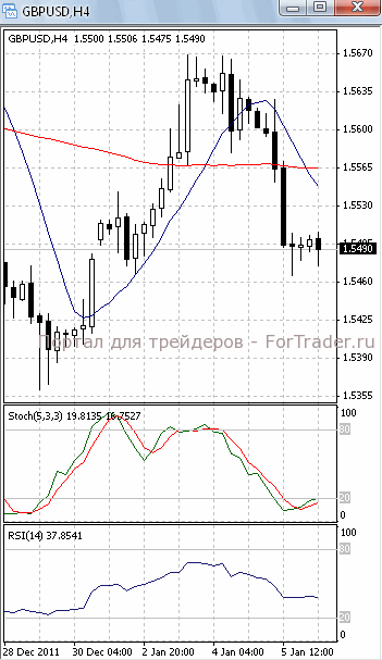 Цены зафиксировались ниже уровня поддержки 1.55. Это позволяет ждать развития нисходящего движения, первичной целью которого, скорее всего, станет отметка 1.5450/30. В пользу дальнейшего падения свидетельствует и то, что на 4-х часовом графике (рис.1) МА (10) приобрела нисходящую направленность. К тому же скользящие средние формируют «мертвый крест». Вниз развернулся и RSI. SS в зоне перепроданности наметил разворот в противоположную сторону, сигнализируя о вероятности отката к уровню 1.5550.