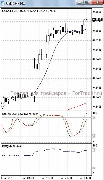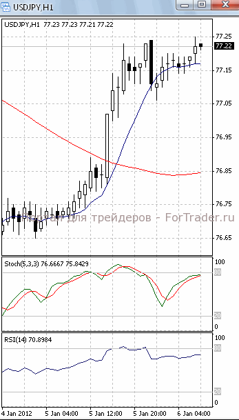 На часовом графике (рис.2) ситуация складывается аналогичным образом. И «быстрая», и «медленная» скользящие средние направлены вверх, тем самым, подтверждая предположение о возможности прорыва указанного уровня сопротивления и продолжения фазы роста. Но SS вошел в зону перекупленности, RSI наметил разворот вниз. Поэтому не стоит полностью исключать вероятность отката.