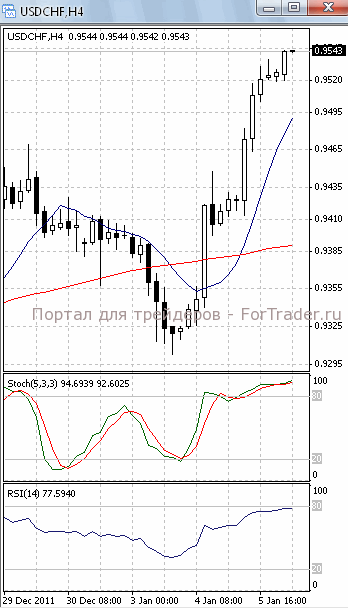 Цены тестируют уровень сопротивления 0.9540. Если и он будет преодолен, продолжится подъем, первичной целью которого, скорее всего, станет отметка 0.96/0.9610. В пользу такого исхода позволяет говорить то, что на 4-х часовом графике (рис.1) МА (100) и МА (10) приобрели восходящую направленность. К тому же они сформировали бычье пересечение. В то же время оба осциллятора наметили разворот в противоположную сторону (стохастик в зоне перекупленности), сигнализируя в пользу возвратного хода к отметке 0.95.