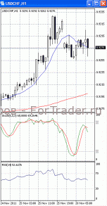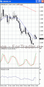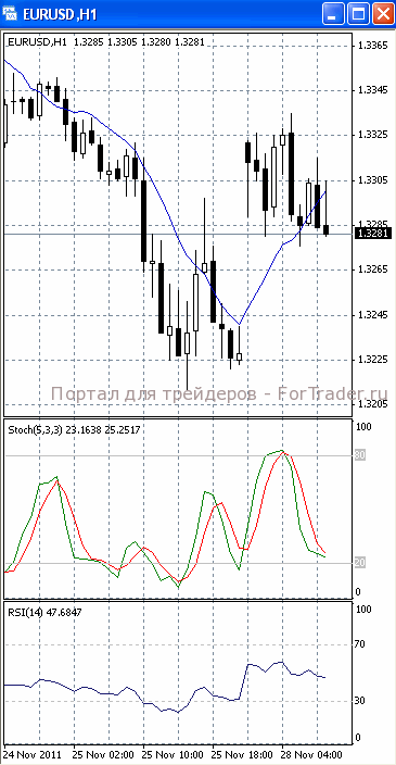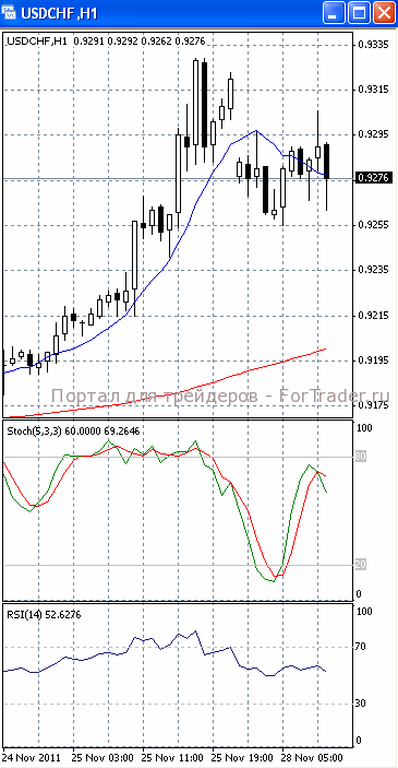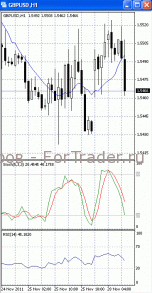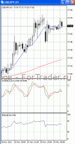 На часовом графике (рис.2) «быстрая» скользящая средняя уверенно устремлена вверх, тем самым, подтверждая предположение о возможности отката. Оба осциллятора направлены вниз.