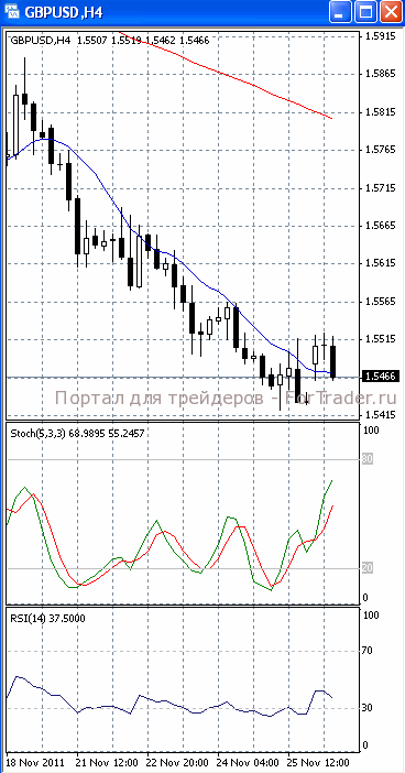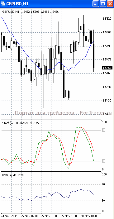 Цены движутся к уровню поддержки 1.5450/30. Если он будет преодолен, стоит ждать дальнейшего падения, первичной целью которого, скорее всего, станет отметка 1.54. О возможности развития нисходящего движения свидетельствует то, что на 4-х часовом графике (рис.1) МА (100) уверенно устремлена вниз. Вниз пока направлена и МА (10). В медвежьем направлении развернулся и осциллятор RSI. Хотя SS устремлен вверх. Поэтому не стоит полностью исключать вероятность возвратного хода к отметке 1.55.