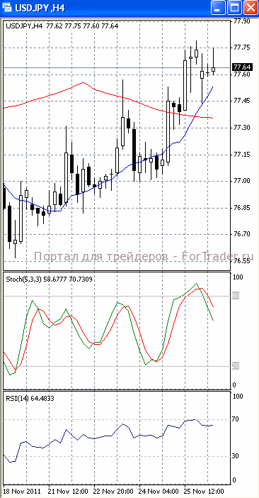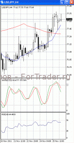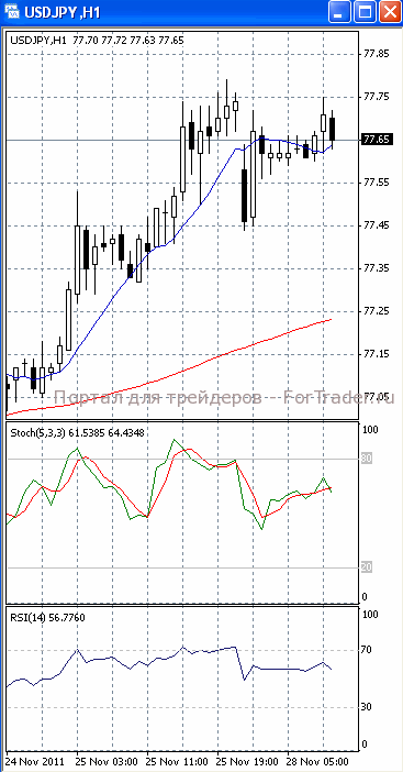 На часовом графике (рис.2) и «быстрая», и «медленная» скользящие средние направлены вверх, сигнализируя о возможности развития фазы роста. RSI и SS развернулись вниз, сигнализируя о вероятности отката к поддержке 77.30.