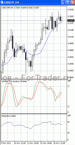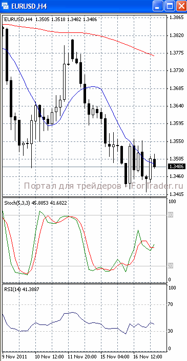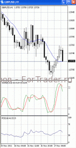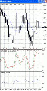На часовом графике (рис.2) «быстрая» скользящая средняя приобрела восходящую направленность, тем самым, подтверждая предположение о возможности еще одной попытки тестирования уровня 1.35. Осцилляторы разворачиваются вниз (стохастик выходит из зоны перекупленности).