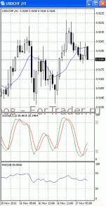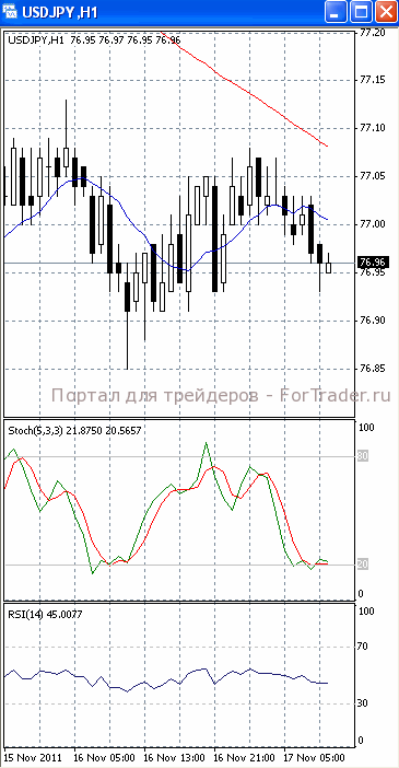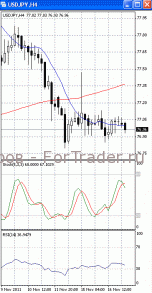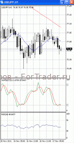 На часовом графике (рис.2) обе скользящие средние устремлены вниз, тем самым, подтверждая предположение о возможности прорыва нижней границы канала и дальнейшего падения. Вниз наметил разворот и SS. RSI разворачивается вверх, сигнализируя в пользу возврата цен к отметке 77.15.