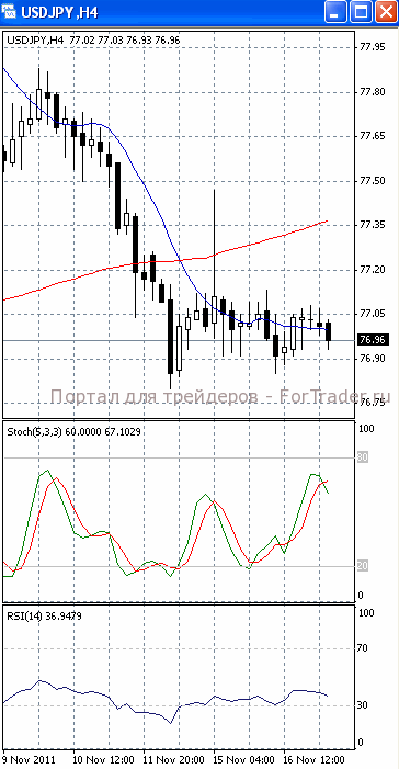 Динамика движения цен по-прежнему ограничена узким диапазоном 76.85 – 77.15. На 4-х часовом графике (рис.1) МА (10) и оба осциллятора приобретают нисходящую направленность, сигнализируя в пользу того, что цены предпримут попытку выйти из диапазона с прорывом его нижней границы. В то же время МА (100) направлена вверх. Поэтому не стоит полностью исключать вероятность начала фазы роста в пределах указанного канала.