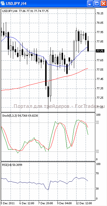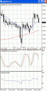 Цены возвращаются к уровню поддержки 77.60. Если он будет пройден, стоит ждать дальнейшего падения цен к отметке 77.30. В пользу начала нисходящей фазы движения своим разворотом сигнализировали осцилляторы на 4-х часовом графике (рис.1). В то же время и МА (10), и МА (100) достаточно уверенно устремлены вверх. Поэтому вполне возможно, что цены все же возобновят подъем к сопротивлению 78.00.
