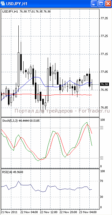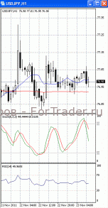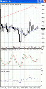 На часовом графике (рис.2) «быстрая» скользящая средняя наметила разворот вниз. В медвежьем направлении устремлен и осциллятор SS. Все это подтверждает предположение о возможности падения цен к отметке 76.85. RSI наметил разворот вверх.