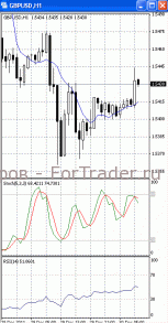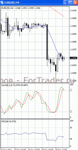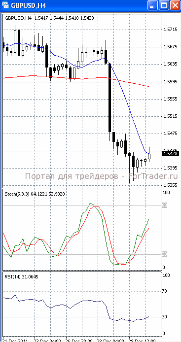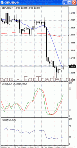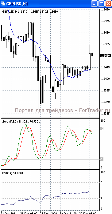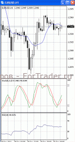 На часовом графике (рис.2) «бысьрая» скользящая средняя направлена вверх, тем самым, подтверждая предположение о возможности развития восходящей фазы движения. SS и RSI развернулись в противоположную сторону, сигнализируя в пользу возобновления нисходящего движения.