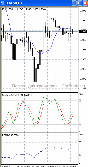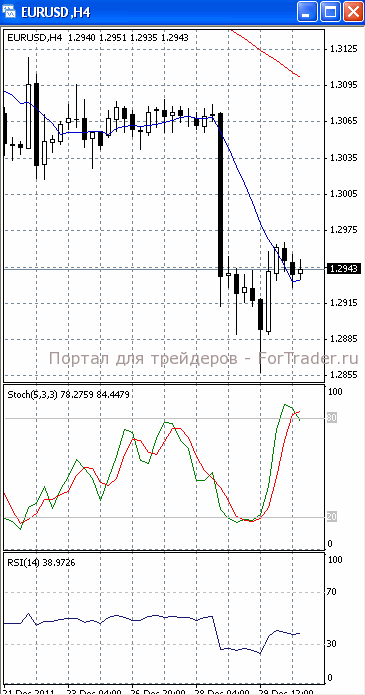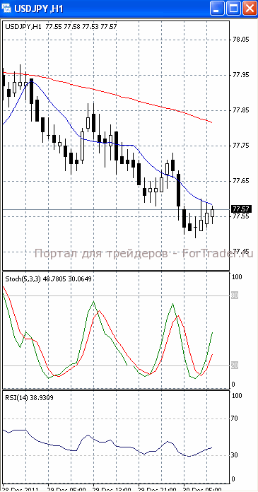 На часовом графике (рис.2) ситуация складывается аналогичным образом. И «медленная», и «быстрая» скользящие средние направлены вниз, сигнализируя в пользу возобновления нисходящего движения. RSI и SS направлены вверх.