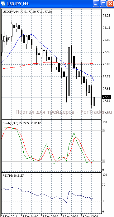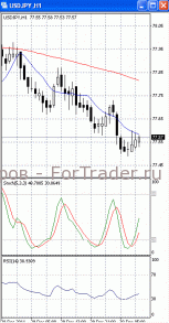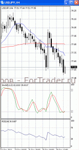 Цены возвращаются к отметке 77.60, но уже как к сопротивлению. Если она будет пройдена, стоит ждать дальнейшего роста, первичной целью которого, скорее всего, станет отметка 78.00. О начале фазы роста своим разворотом сигнализировали осцилляторы на 4-х часовом графике (рис.1). В то же время МА (10) и МА (100) приобрели нисходящую направленность. Поэтому вполне возможно, что цены после отката возобновят падение и протестируют отметку 77.30.
