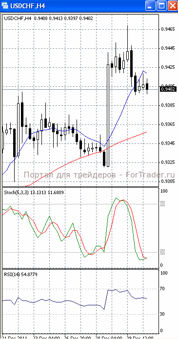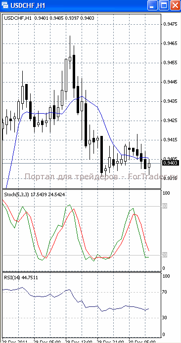 На часовом графике (рис.2) «быстрая» скользящая средняя приобрела нисходящую направленность, тем самым, подтверждая предположение о возможности прорыва указанного уровня поддержки и дальнейшего падения цен. SS и RSI развернулись в бычьем направлении, сигнализируя в пользу возврата к отметке 0.9430.