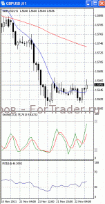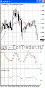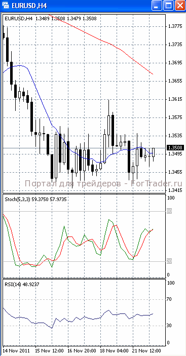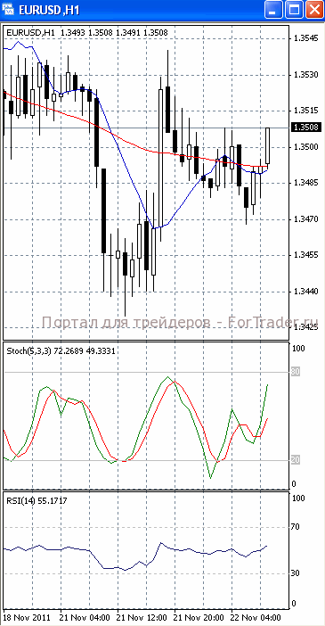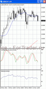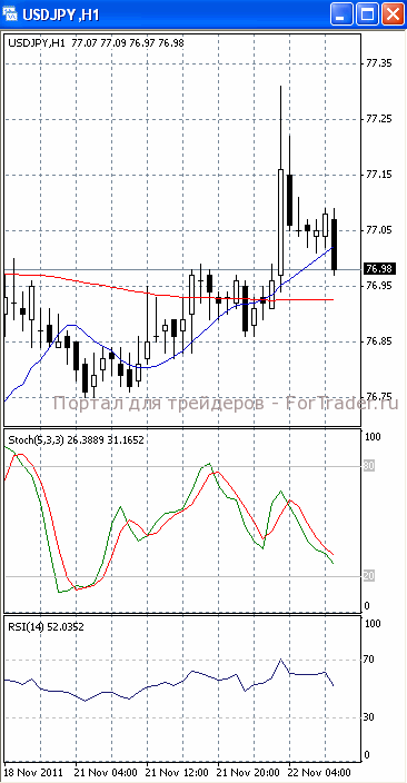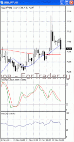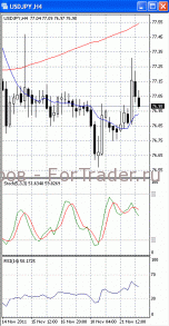 На часовом графике (рис.2) «быстрая» скользящая средняя наметила разворот в бычьем направлении. Вверх устремлены и SS, и RSI. Все это подтверждает предположение о возможности выхода цен из диапазона с прорывом его верхней границы. Но «медленная» МА устремлена вниз, что свидетельствует о сохранении потенциала нисходящего движения.